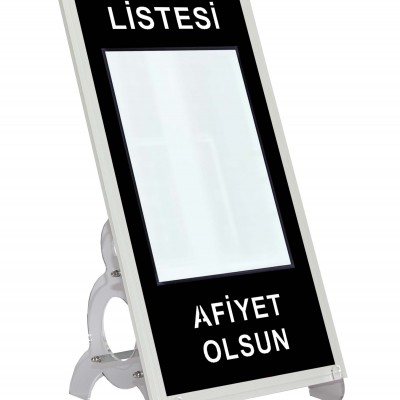 - Ebatları 30x60cm.- Alüminyum kasalı led ışıklı panel.- Ön yüz metal siyah fırın boyalı.- Ön panel üzerinde A4 pleksi ceplik. (Cep içine yazıcıdan çıktı alınarak kolay kullanım imkanı)- 12 V. Adaptörlü,- Açma / kapama anahtarlı, kablolu ve fişli- 1 Takım pleksi ayaklı..